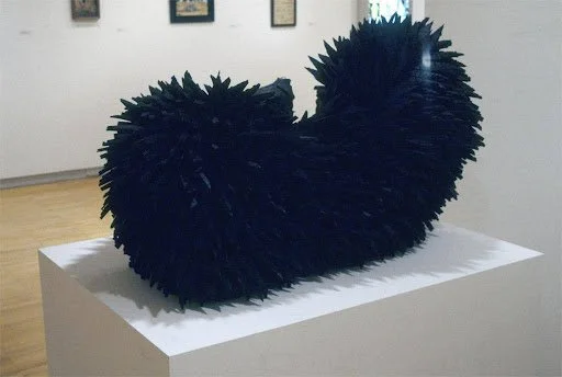 Reclining Torso Breastfeeding Herself, 2000 is an abstract sculpture that is a poised, opal-shaped feminine figure, reclined horizontally and with an extended side. There are arrays of rubber slices spiked all over the surface of the figure. The sculpture is an abstraction of a Black female’s torso. The spike application on the exterior surface of the figure is actually signifying energy and a spiritual essence surrounding the torso. Booker is conceptualizing a nurturing soul. But also, there’s a double entendre in this figure that is used to contrast gender and race ideology. Modernist sculptor Alexander Archipenko constructed a black, ceramic glaze sculpture in the early 20th century, Reclining Torso, 1922, which Booker may be using as a similar reference point in her own figure. In spite of her own executed representation of a female figure in a reclined posed, Booker is also making a commentary regarding gender expressions and common depictions of the female body. Booker is addressing with humor how Archipenko and other artists with various mediums commonly depict the female body in the stereotypical, nude, reclining pose. With the execution of her own sculpture, she’s suggesting the redundancy and sexism of such common depictions. There’s satire in this deliberation, though. The idea of a Black woman artist constructing a figure of a nude, Black female torso breastfeeding herself would be interpreted as the profane, ungodly, unnatural or less than feminine. The notion of a woman breastfeeding herself would be akin to female masturbation. I hypothesize that the relevance of a particular critique of the expressions of the Black female body perhaps given in the early 20th century would be as constant in the early 21st century. However, the stereotypical, nude, reclining pose that has been commonly produced by white, male sculptors would be highly regarded with esteem.