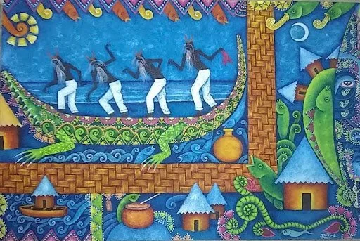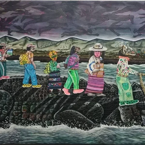 Baltazar Castellano Melo, artista de Cuajinicuilaipa, Guerrero, captura a migrantes de la Costa Chica acercándose a la frontera mientras navegan por la orilla del Río Grande; o en el cuerpo imaginario de un cocodrilo hiperexagerado que los guía en su cauteloso viaje a lo largo de la frontera. Son la personificación de la dualidad tono/humano y/o algunos de los personajes son conocidos como figuras culturales o espirituales dentro de la comunidad. Por ejemplo, el personaje del Coyote o La Minga viste un Pozahuanco, una falda cruzada de tipo tradicional mixteco. Volando sobre los migrantes están los diablos, sirviendo como protección espiritual de su viaje en ruta. La pintura aporta relevancia al artículo sobre el tema de la migración o el desplazamiento debido al posible cambio climático. (Castellano Melo 2022)