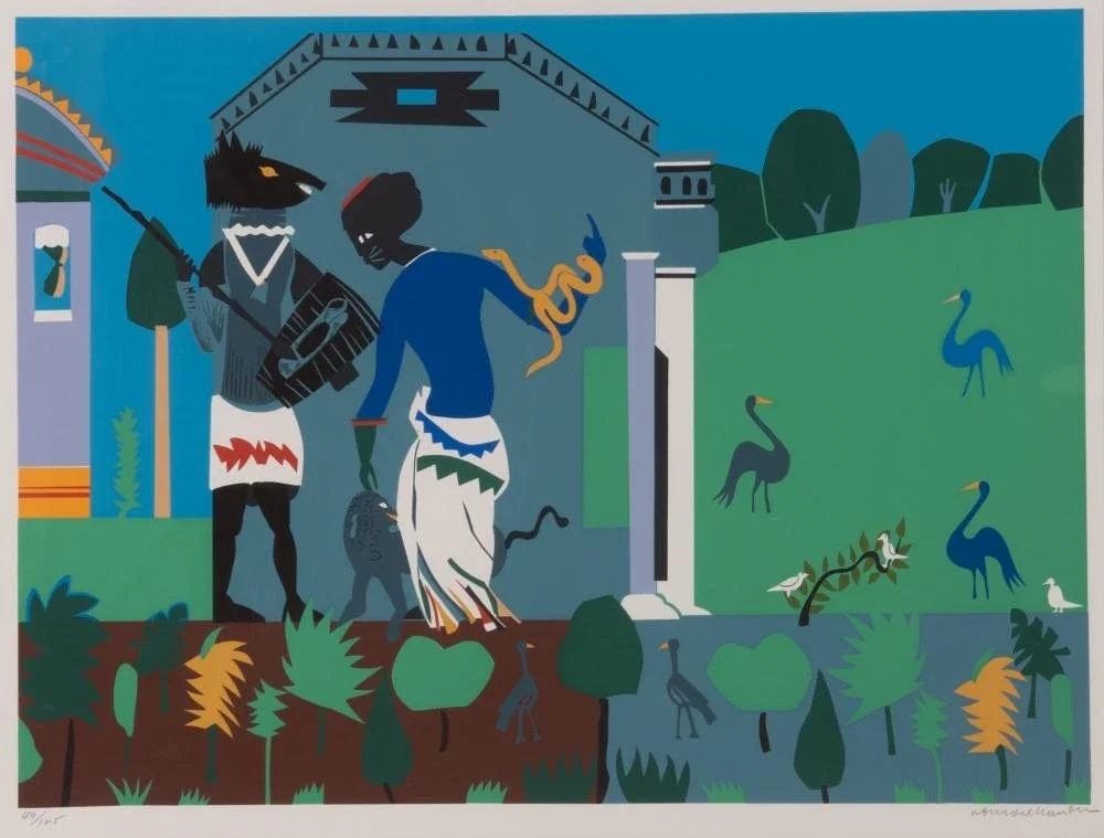 Circe Turns a Companion of Odysseus into a Swine, is a depiction of a witch – Circe – in the company of Odysseus’ crew member. He has been transformed into a pig, compliments of the work of Circe but he appears to be grinning at her - signifying his amusement. Unlike most other feminine bodies in Bearden’s exhibit, Circe is fully clothed. She’s wearing a long, free-flowing, feminine, white skirt with colorful, loose fringes at the bottom. Bearden accessorized her in such a way to display her complexity, as well as, to contradict the one-dimensional characterizations or images typically applied to Black women, witches or even African witchcraft. The ideology places a referendum on West African tradition. There are triangles observed throughout this particular art image. Downward-faced triangles – adorned on Circe’s skirt – are occult signifiers of femininity and water. The companion-turned-swine also has a downward-shaped triangle braced across his neck and chest. Upward-faced triangles are located on the house trim moldings which are occult signifiers of fire and masculinity. Bearden projected masculine energy in the structures. (Breyer, 2014) Circe is cohabited with a diversity of life-force and energy – non-human animals and plants. There are curvilinear forms composed within the images of many of the animals. The most significant is the serpent intimately wrapped around Circe’s arm. The closeness, bright yellow vigor, and curvature in form are expressing a feminine energy. The imagined perilous intimacy with a snake evokes emotions of fearlessness, sensuality and power. But yet, these were never considered redeeming qualities for the Black feminine, thus such energies were pressed to be silenced. Bearden attempts to override that criticism, censure and fear. He projects for the use of the erotic. He doesn’t portray her as devious or malicious, but as overly complex for understanding. With her fruitful association with various animals and a cultivation of green life, she is also projecting certain openness and sensitivity.