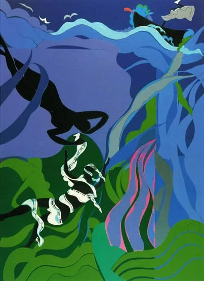 The mythical sea nymph – Ino – rescuer of Odysseus gives into the longing for liberation and safekeeping. Bearden’s colors, forms and lines create an island beneath the sea – a place of refuge – in The Sea Nymph. Odysseus being enwrapped in the curvilinear of the white ribbon and layers of sea greenery signifies an organic safekeeping. The curve forms in the ripples of the sea and in Ino’s body channels a feeling of the erotic, a realm of non-inferiority, sensuality and closeness. It is from this trust that Odysseus made it home safely.