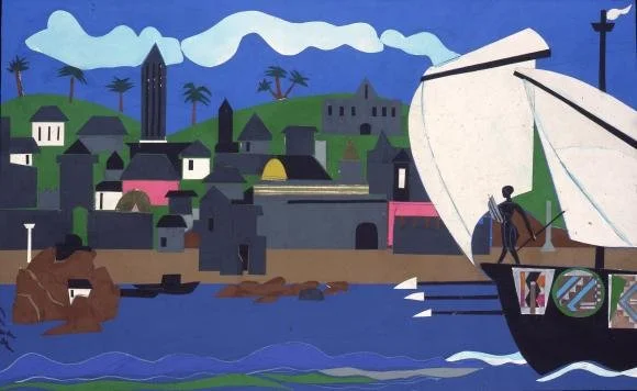 Romare Bearden’s collage paintings combined aesthetics of coolness and aesthetic representations of blackness together as an assertion of power in Black identity. Although, there were wars and litanies of death throughout the classic, Bearden emphasized many of his collage paintings with blue skies, fluffy clouds, high and elevated mounds, tropical vegetation, wild and exotic animals, and the deep, blue sea. In spite of the deaths and victories incurred from the Trojan War, Home to Ithaca – the first image of the exhibit – provides a calm, cool and undisturbed balance to the presentation. The natural scenery is in accompaniment of various shapes of building structures. Odysseus’ ship is moving progressively forward and homeward bound, cool and unaffected by earlier episodes of war and struggle. At the head of the ship is a relaxed, feminine, black silhouette figure casually guiding the sail with an armored shield in one hand and a sword in the her other hand. The representation of the black feminine is very poised in presentation and strong and curvy in form. There is assertiveness in her presentation; a display of agency in her own physical, emotional and psychic expressions and well-being, as also seen in other female human characters within A Black Odyssey collection. The significance of these symbols is that Bearden’s human figures securely enjoy their own imagination of blackness and its experience in a way that differs with Black contemporary realities in the Western world. As a Black man of a lighter phenotype, the artist used this artwork to challenge Western constructions of Black bodies of expression and the negative consequential racial internalization of deep, rich melanin. But also, he used the colors and forms of other features in the collage as an accessory and reinforcement to the woman’s character and integrity. Assuming a position at the head of the ship independently - armor and weapon in both hands - gives insight to her confidence and cool resilience. The intensity of her black-silhouetted skin is an ingrained reflection of the black and gray, sturdy, building structures. However, her hue is also a warm offset to the green vegetation, blue sky and soft, white clouds. And yet, the calm, cool, and natural scenery complemented the integrity of her character and physical blackness. Bearden tied in all of these features, colors, style and form on the collage that translated to a black, cool, assertive and soulful aesthetic that Rebecca Walker likes to conceptualize as the innate “blackcool” of Black bodies of expression. Walker professed this concept as a way to recognize and celebrate a distinctive aesthetic that “is made up of elements that can be traced back to a place, a people, and a culture...” When explaining this concept, she characterized a particular artist who, “through audacious aesthetic choices, asserted a profound authenticity and thus resistance to all that would rob her of her subjectivity”. (2012, xi –xv) This is the power that Romare Bearden illuminated in A Black Odyssey.